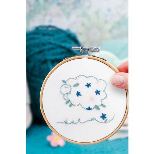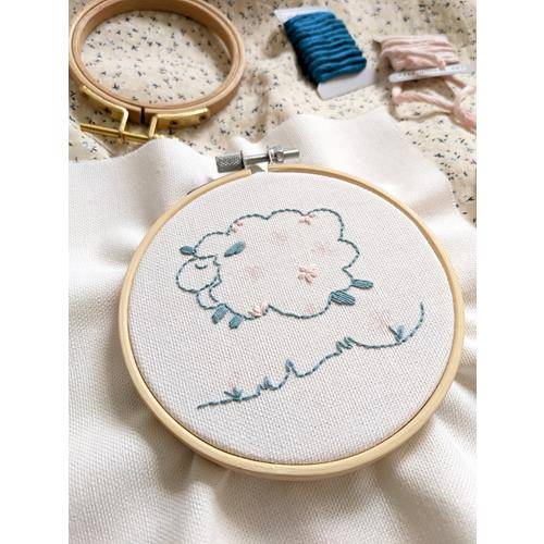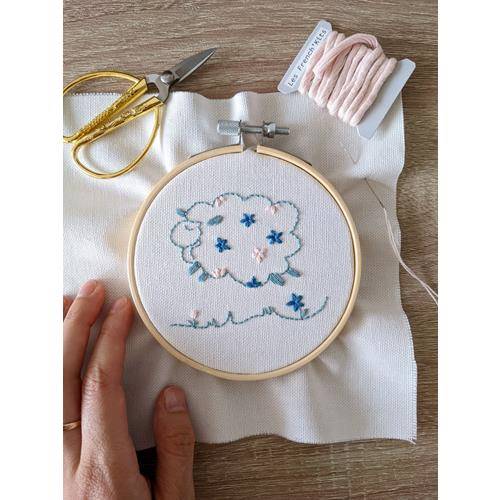 Cette broderie "Joyeux mouton" est si poétique ! Elle vous emmène immédiatement en enfance. On s'imagine à regarder sautiller ce joli mouton tout doux avec ces petites fleurs bleues et roses glanées au fil de ses galipettes !