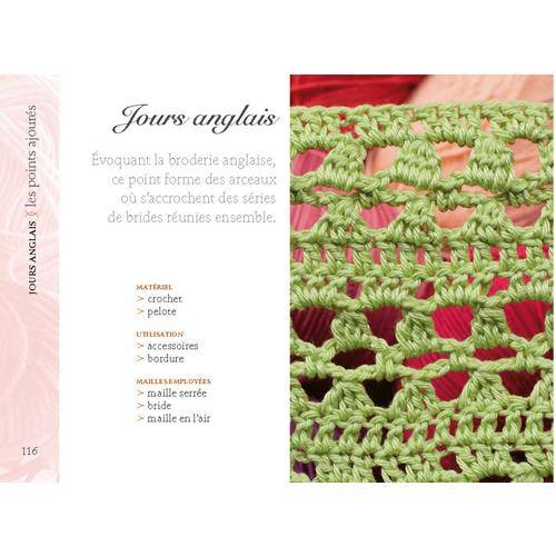 En 176 pages, les points de crochets les plus utilisés décrits dans des pas à pas illustrés de photos claires et pédagogiques, qui montrent aussi le rendu une fois le point réalisé. Chaque double page donne aussi des conseils pour se repérer, de variante, et indique les points  employés ainsi que les utilisations conseillées (type de réalisation ou partie de l'ouvrage).