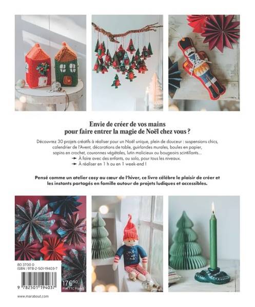 Découvrez 30 projets créatifs à réaliser pour un Noël unique, plein de douceur : suspensions chics, calendrier de l'Avent, décorations de table, guirlandes murales, boules en papier, sapins en crochet, couronnes végétales, lutin malicieux ou bougeoirs scintillants...