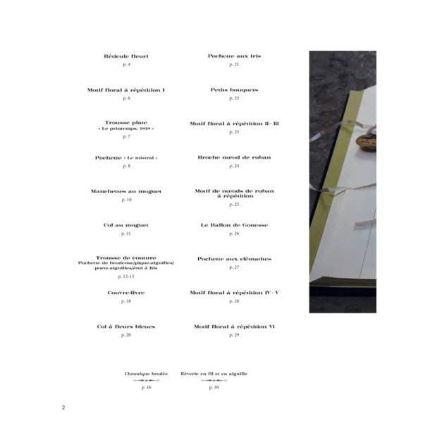 Au fil des 88 pages de ce livre, plongez dans l’univers raffiné de son auteure, brodeuse passionnée par les motifs antiques. Son interprétation contemporaine donne vie à de superbes projets brodés avec différents points et matières (coton mouliné, ruban, fil chenille…) :