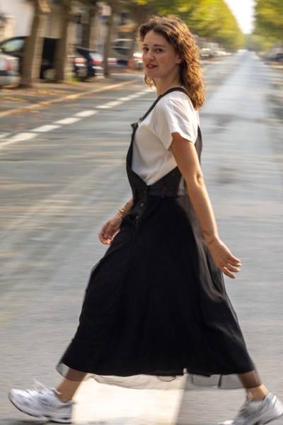 Je conserve mes détails essentiels sur le haut du vêtement, tout en changeant d’allure selon la jupe choisie :