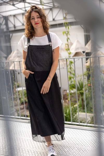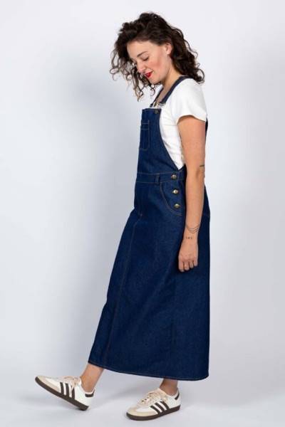 Je suis la salopette robe Crystal, un classique revisité pour devenir un vêtement moderne, que l’on peut coudre de trois manières différentes. Je conserve les détails qui définissent ce classique : une coupe ample, une bavette devant et dos, des bretelles réglables, une grande poche poitrine à compartiments, des ouvertures boutonnées sur les côtés, deux poches italiennes devant et des surpiqûres contrastées.