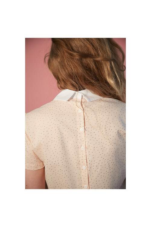 Je suis un chemisier à manches courtes, boutonné dans le dos. En toute douceur, je donne une touche habillée aux tenues les plus sobres pour vous accompagner dans votre quotidien.