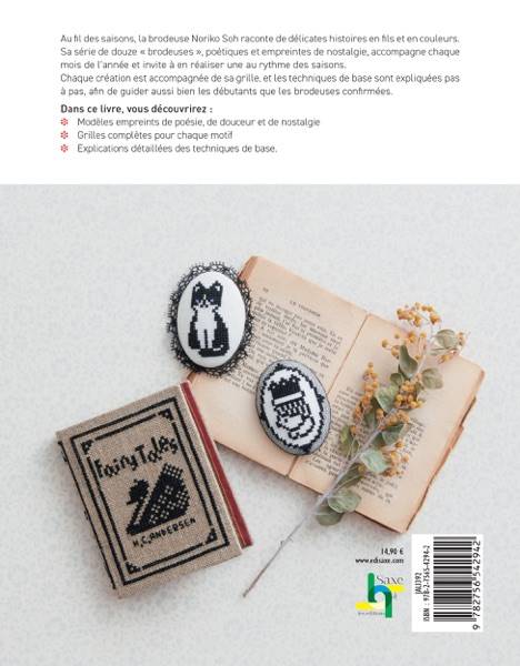 Au fil des saisons, la brodeuse Noriko Soh raconte de délicates histoires en fils et en couleurs. Sa série de douze « brodeuses », poétiques et empreintes de nostalgie, accompagne chaque mois de l’année et invite à en réaliser une au rythme des saisons. Chaque création est accompagnée de sa grille, et les techniques de base sont expliquées pas à pas, afin de guider aussi bien les débutants que les brodeuses confirmées.